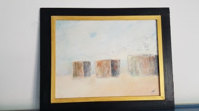 De man haalde uit een plastic tasje twee doeken. De één, een klein doek van een donkere onstuimige zee met dreigende lucht en een gouden lijst. Het andere doek was een slag groter (zo ongeveer 30×40 cm) met daarop een lichter tafereel met een goud en donkere omlijsting. Ik was zo verrast dat ik even de tijd nam om het moment en de doeken in me op te nemen. We brachten ze naar beter licht en mijn ogen besloten snel. Het lichtere doek met de zachte lucht en zandachtige ondergrond waarop blokken (strandhuisjes, pilaren of wat dan ook) te zien waren, bleef aan mijn ogen trekken. Het mysterieuze en het luchtige trok me aan en ik koos dit schilderij. Een echte Jaap de Jonge. De kunstenaar signeerde het schilderij en ik ging naar huis met een prachtig nieuw doek.